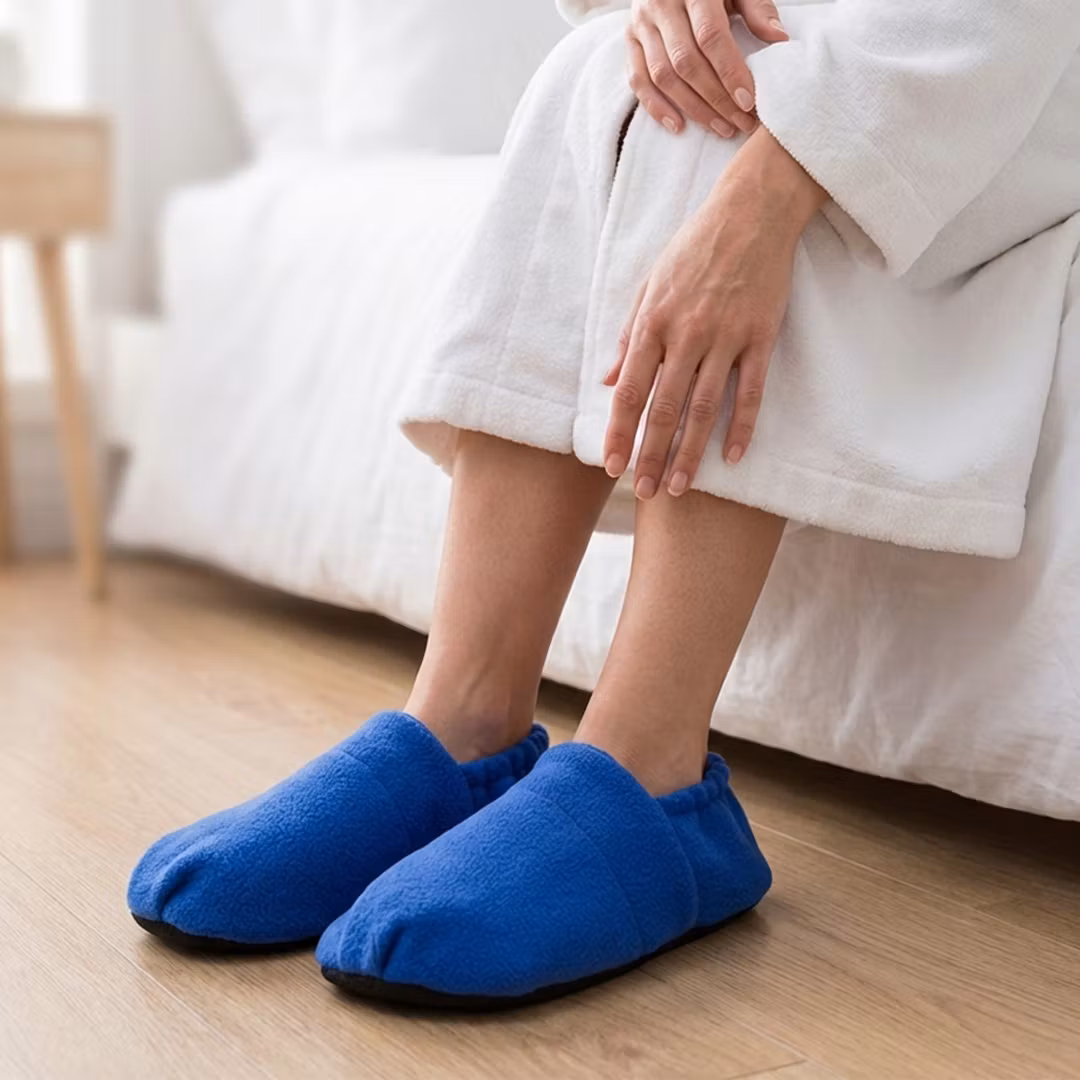 Unngå kalde føtter med disse stilige og behagelige, varmende tøflene. Ta varmeputen ut av tøffelen og varm den i mikrobølgeovnen i 90 sekunder. Legg den tilbake i tøffelen og nyt varmen som sprer seg til føttene dine.