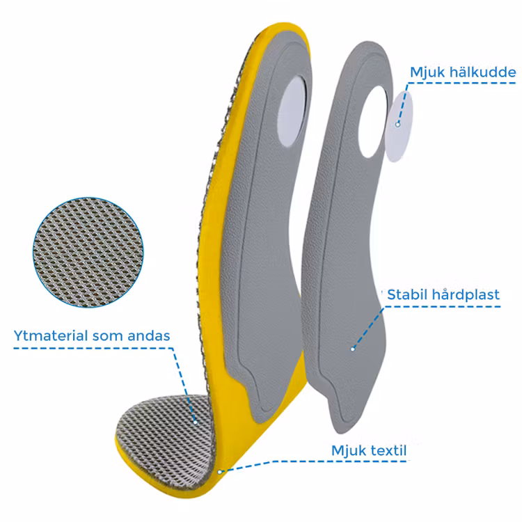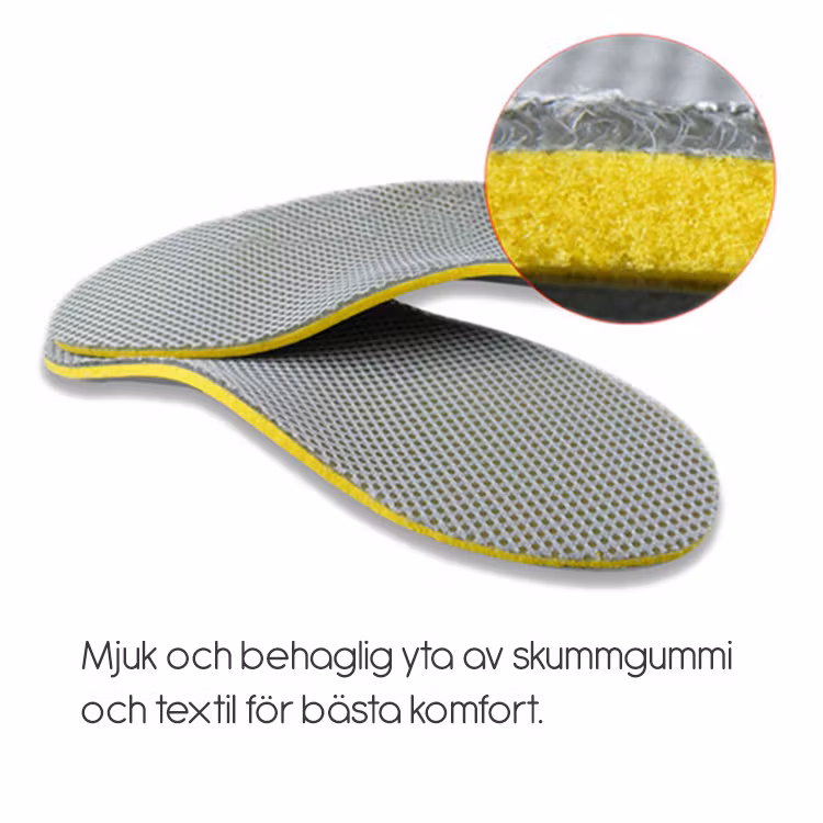 Et par behagelige skosåler med myk og komfortabel demping i hælen og en forhøyning under fotbuen som gir støtte for pronasjon. Innleggssålene fungerer utmerket å bruke i både arbeidssko men også hverdagssko (joggesko/converse).