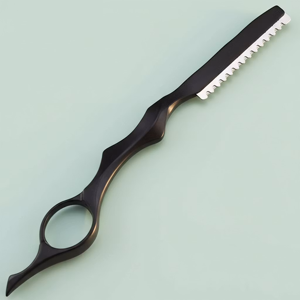 En profesjonell frisørkniv som brukes av frisører for å tynne ut håret. Frisørkniven er behagelig å holde og støtten til fingeren gjør det til en drøm å jobbe med. Uttynningskniven er av veldig høy kvalitet og kan brukes både hjemme og i salongen.