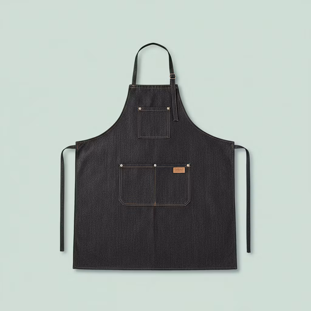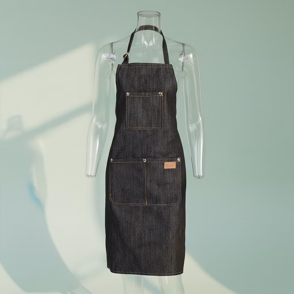 Et forkle med romslige lommer foran for frisørsaks, børster, kammer og hårpleieprodukter – et forkle for frisører laget av jeansmateriale i høy kvalitet.