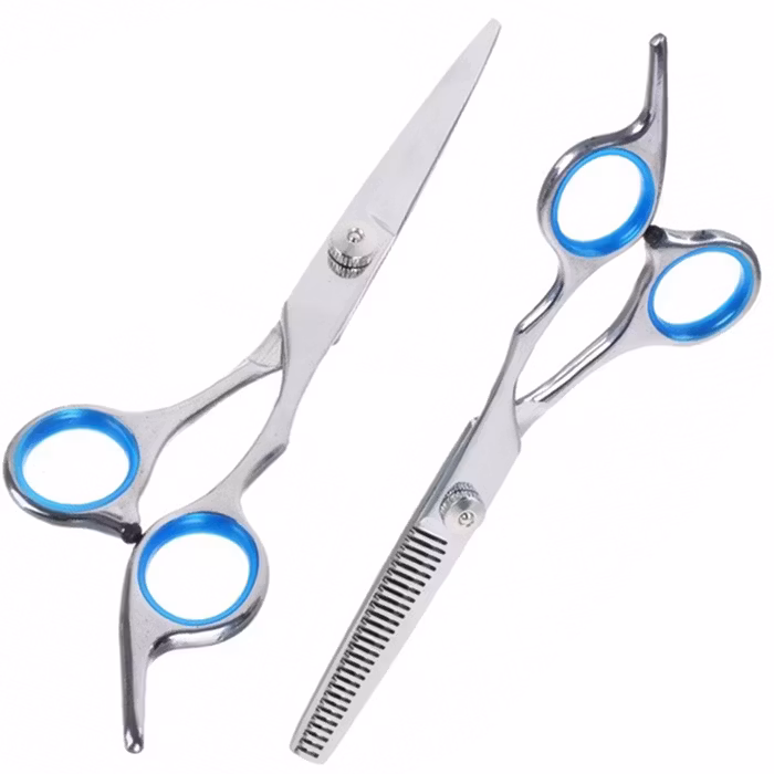 To fantastiske frisørsakser av høy kvalitet som kan brukes hjemme eller i frisørsalongen. Frisørsaksen brukes for å klippe håret og uttynningsaksen til å tynne ut tykt hår eller for å få forskjellige lengder og skape volum i håret.