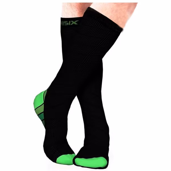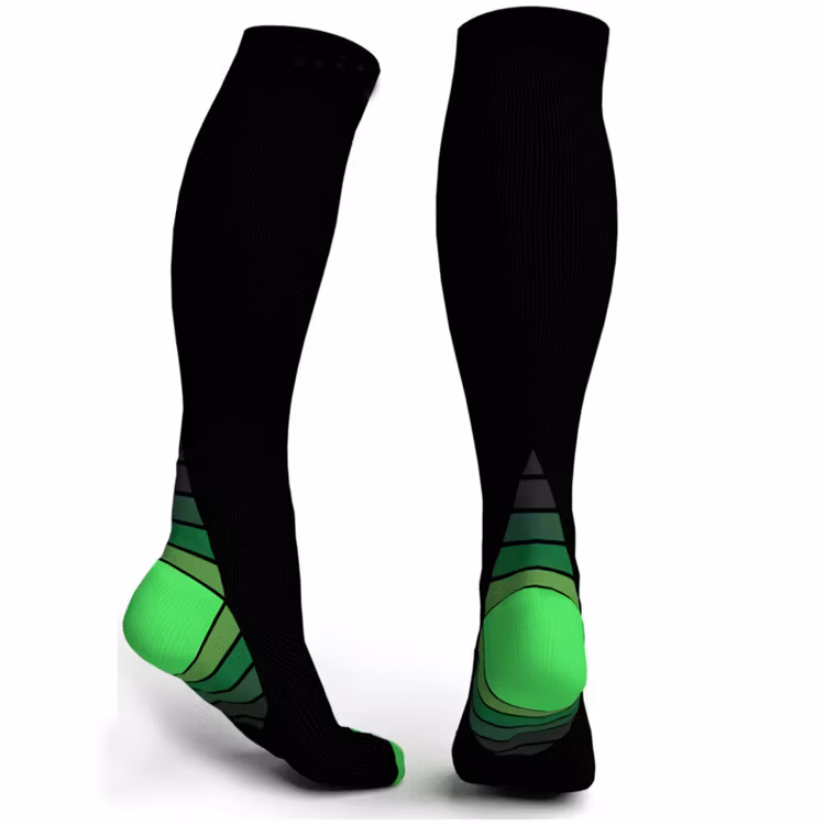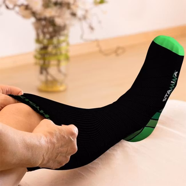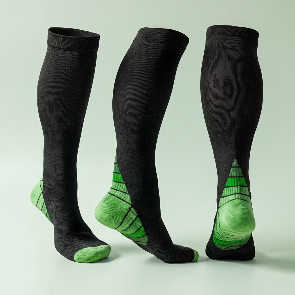 Et par grønne strømper med kompresjon som hjelper deg å øke blodsirkulasjonen i føttene og beina. Strømpene forebygger åreknuter, reduserer risikoen for skader når du trener og bidrar til å holde sirkulasjonen oppe under for eksempel flyturer.